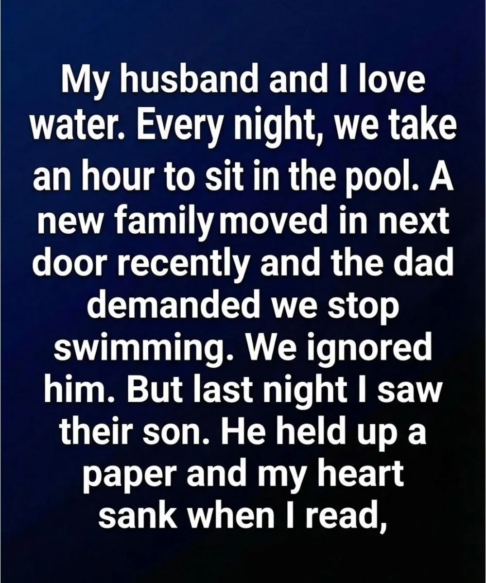 It was a typical night. The air felt warm but not sticky. The pool lights cast a soft glow onto the water, turning it a gentle shade of blue. My husband and I were standing near the edge, towels wrapped around our shoulders, talking quietly.