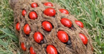 Found this weird fuzzy cone with bright red berries popping out of it under my tree.