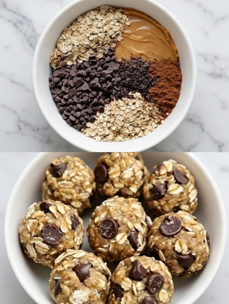 These energy balls are formed by binding dry ingredients (oats, cocoa, chocolate chips) with wet ingredients (peanut butter and honey). Chilling helps the mixture firm up, making it easy to roll into compact, round shapes without baking.