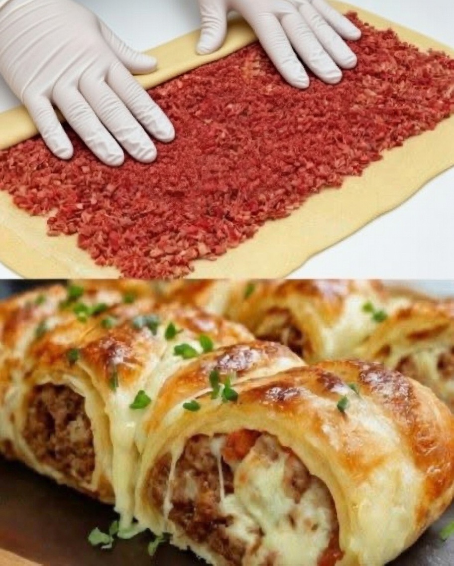 Spread the meat mixture evenly over half of the pastry, leaving a small border around the edges. Fold the other half over the filling to create a rectangle or roll it up like a log, depending on your preferred shape.
