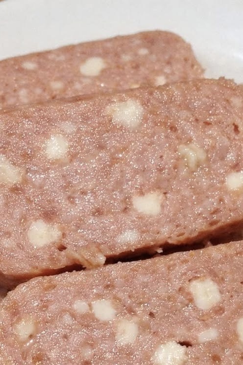 The fat in the meat rises to the surface and solidifies as it cools, which can create the appearance of white spots. This is a natural occurrence in processed and cooked meats, especially those that are canned.