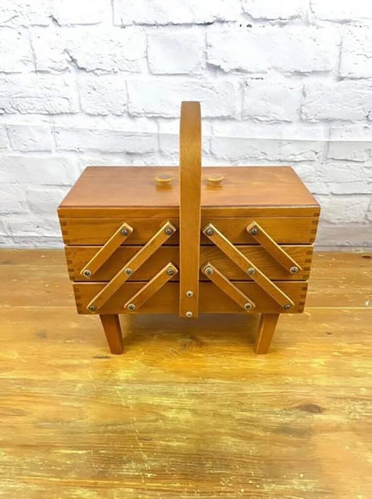 It was an old sewing box , once an indispensable item in many homes. In a time when people repaired, altered, and personalized their clothes, this type of box was part of everyday life. Each compartment held spools of thread, needles, and carefully sorted buttons: a true treasure trove of organization and craftsmanship.